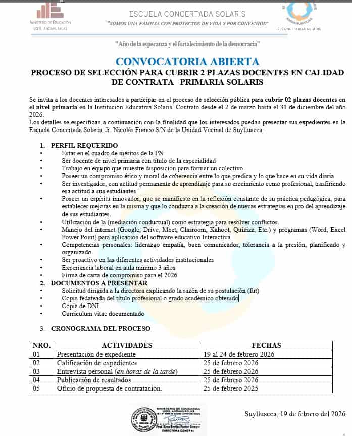 Se invita a los docentes interesados a participar en el proceso de selección pública para cubrir 02 plazas docentes en el nivel primaria en la Institución Educativa Solaris. Contrato desde el 2 de marzo hasta el 31 de diciembre del año 2026.